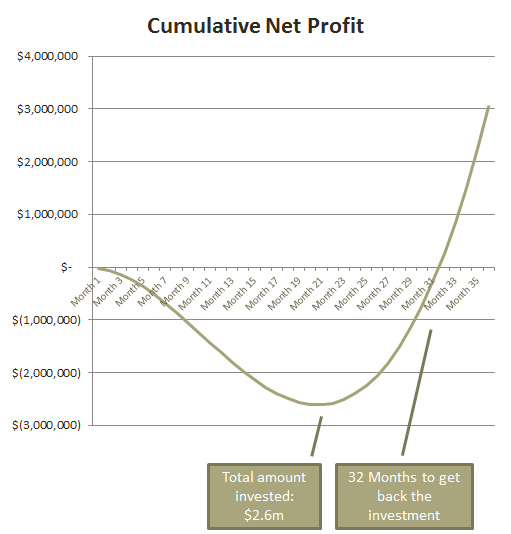 The model shows that the worst loss is $190k per month, and that the first profit comes after 21 months.